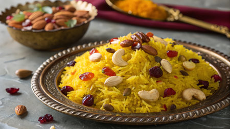 Basmati rice cooked with spices saffron and dried fruits to create the Kashmiri pulao
