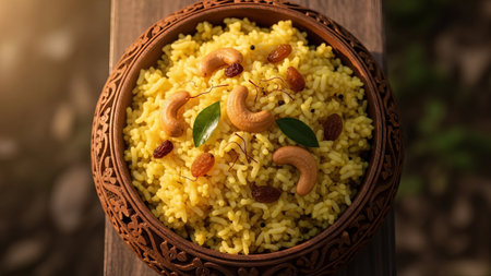 Yellow rice with cashews, raisins, and saffron in a carved wooden bowl outside.