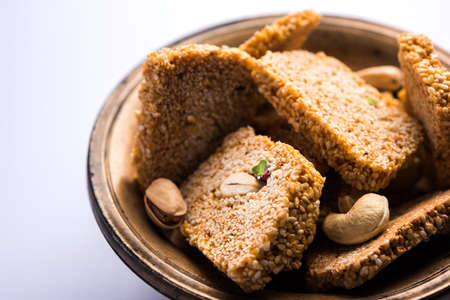 Gajak or til papdi or patti is a dry sweet cake - made of sesame seeds, ground nuts and jaggery, consumed in indian winter especially during Makar Sankranti festival on 14th january