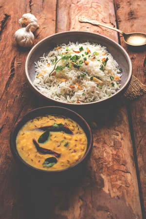 Basmati Rice Pilaf or pulav with Peas, or vegetable rice using green peas also known as matar pulav, with added yellow colour, served with plain dal