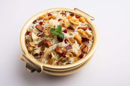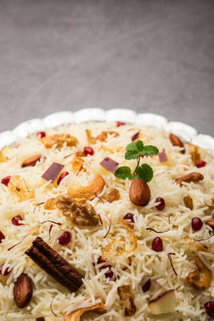 Kashmiri sweet modur pulao made of rice cooked with sugar, water flavored with Saffron and dry fruits