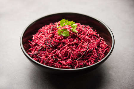 Beetroot Rice or pulao or pulav served in a bowl or karahi, selective focus. Indian food