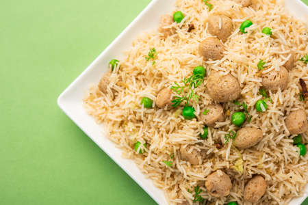 Yummy soya pulao or pilav or pulav or rice or soyabean chunk fried rice with peas and beans, indian or pakistani cuisine