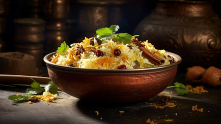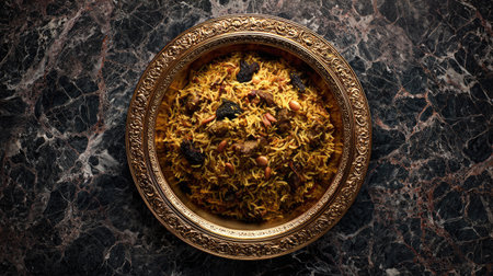 A beautifully presented biryani dish in a decorative metal plate showcases a blend of spices, herbs, and vibrant ingredients on a polished marble surface.