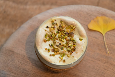 A creamy coffee pistachio dessert topped with chopped nut garnish, cozy autumn table setting and warm tones