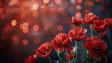 Field of red poppies with selective focus, shallow depth of field