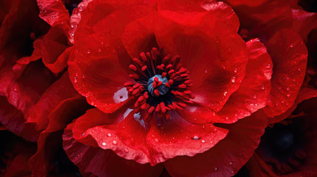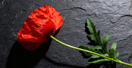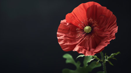 Red poppy flower on black background symbolizing remembrance for Anzac Day Memorial Day and Remembrance Day. Concept Anzac Day, Memorial Day, Remembrance Day, Red Poppy Flower, Symbolism