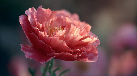 Dreamy light shines on a delicate pink peony flower in bloom