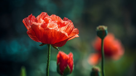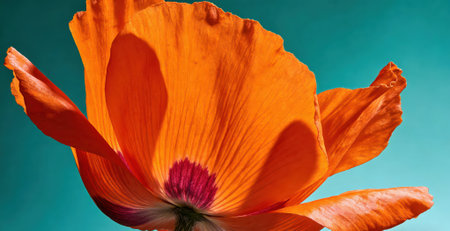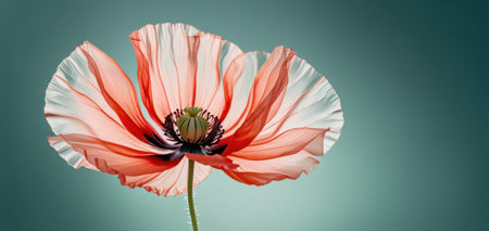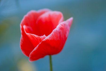 vibrant red poppy flower with delicate petals against a teal background, concept of nature