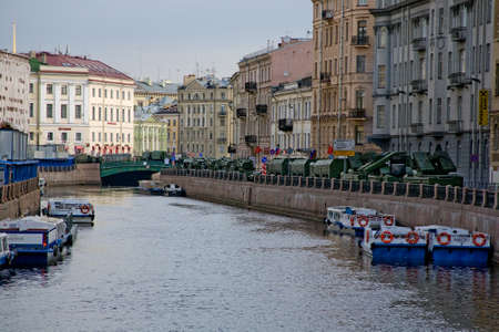 St. Petersburg, Russia-May 9: The military equipment costs waiting for parade on the river bank the Sink in the city St. Petersburg, Russia May 9 2013. In the city of St. Petersburg annually on May 9 passes parade with participation of military equipme