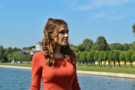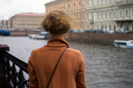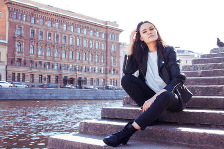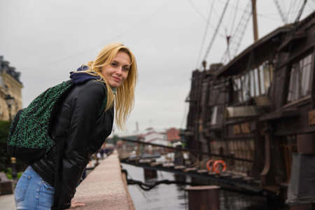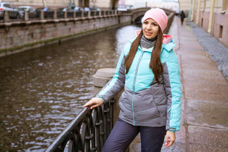 beautiful girl in a jacket looks at the camera leaning on a handrail in St. Petersburg