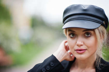 Close up portrait of beautiful blonde sexy fashion woman model in cap and in all black with bright makeup.