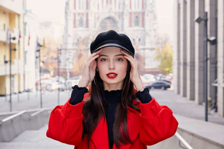 Stunning charming unsurpassed girl with bright red lips and brown hair in a cool red coat in a black cap looks directly into the frame and holds both hands near the temples. City traffic in background