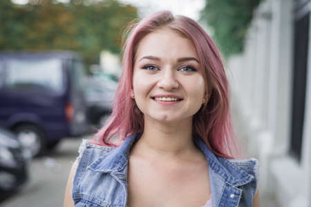 Street style of a young woman in her 20s. Caucasian female 25 years old is walking along the avenue of the European city in the downtown. Slim white girl in denim shorts and a jacket walks outdoors.