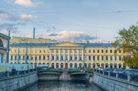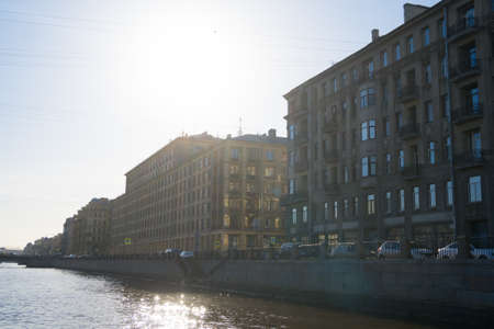 View of old houses on the embankment of the Moika River, St. Petersburg, Russia. early sunny summer morning