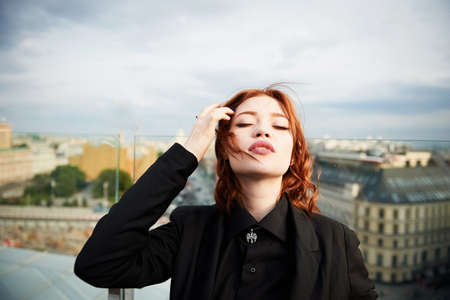 Beautiful red-haired girl with plump lips. Walking around the city. A natural beauty. Roof. Ginger