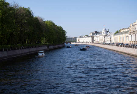 Saint Petersburg, Russia - June 15, 2016: Excursion boats float down the river Fontanka. 15 June 2016 in Saint Petersburg, Russia