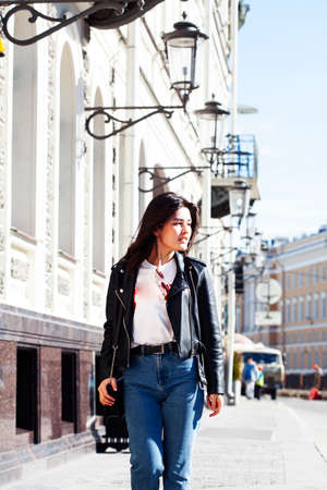 young pretty asian girl wearing leather jacket outside on big city street, lifestyle people concept