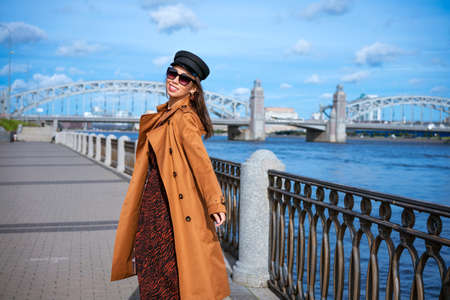 Happy young woman of Caucasian ethnicity in a light brown coat and black cap posing on the embankment against the backdrop of the bridge and the blue sky.