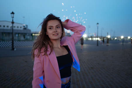 A young stylish brunette in a pink jacket, neon lighting, blue light