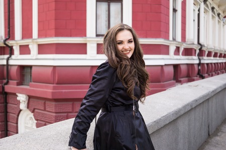Portrait of young smiling caucasian brunette woman. Businesswoman outdoors in business downtown. Urban city street lifestyle. Long coat and hair. Careerist. Women career. Showing freedom holiday time