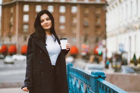 Beautiful serious smart brunette girl holding cup of coffee in hands goes walking down street in a enter on blue bridge. Charming thoughtful woman with long hair wanders alone, immersed in thoughts