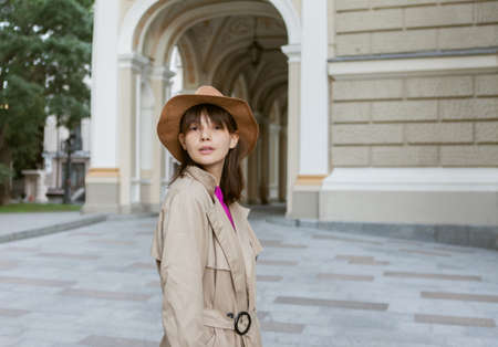 Fashion portrait of young woman in a felt hat and autumn trench coat in city