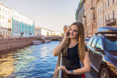 Young joyful woman traveler having cellphone conversation while walking in old town during summer trip, standing near canal water background with copy space for promotional content. Happy female