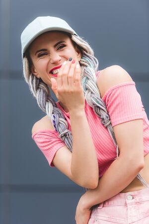beautiful stylish girl with dreadlocks in hat laughing and gesturing with hand
