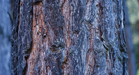 Close up of the bark of old Canarian pine tree, also known as Pinus canariensis, endemic growing at high altitude near volcano Teide. Macro focuse, blurred foreground and background. Tenerife, Spain.