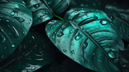 Abstract background with closeup view on large green leaves of monstera in drops. Summer botanical wallpaper with seasonal jungle foliage. Horizontal illustration for banner design. Generative AI.
