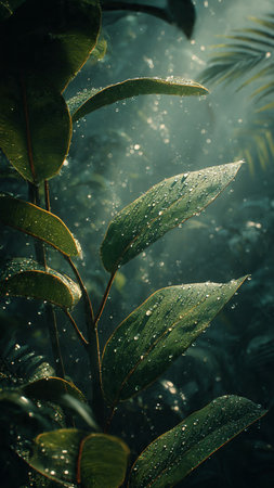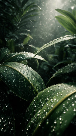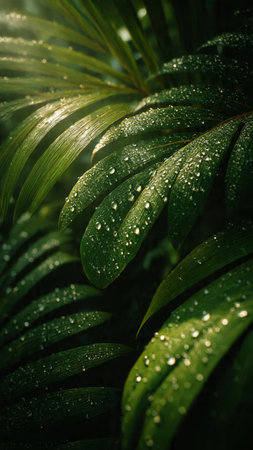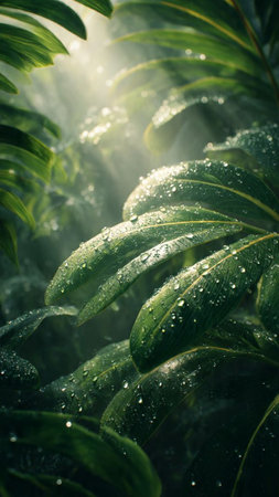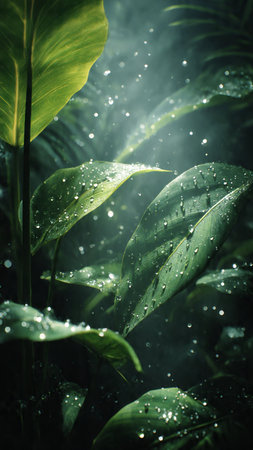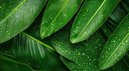 Lush green tropical leaves with dewdrops showcasing vibrant natural beauty.