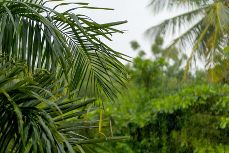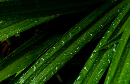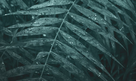Closeup palm leaves with rain drops, rainy season