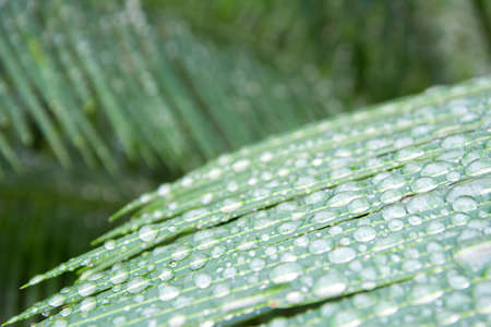 background of closeup water droplets on green cycad leaf in the natural