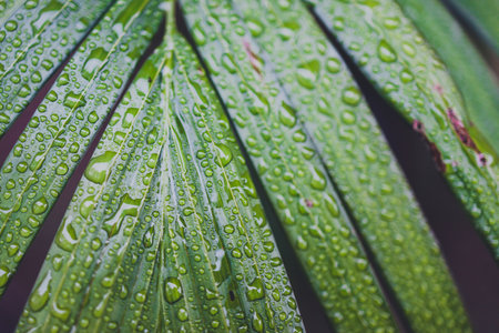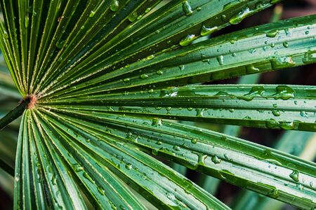 Tropical rain drops on green palm leaves. Nature background.