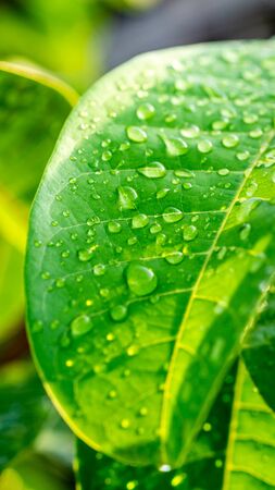close-up water drop on lush green foliage after rainning.