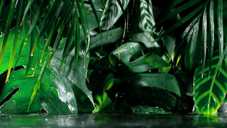 Detail view of green tropical leaves with drops of water