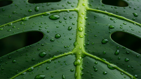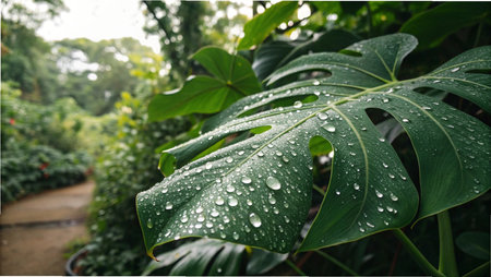 Lush green monstera leaf adorned with sparkling water droplets after a refreshing rain shower