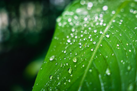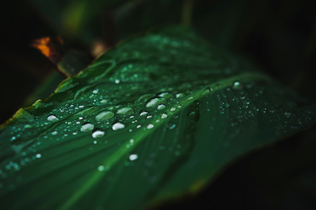 Green leaf with rain drop in jungle. Water drop on leaves. Green leaf texture background with minimal pattern. Green leaves in tropical forest on dark background. Greenery wallpaper. Botanical garden.