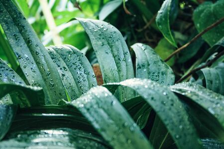 Tropical rainforest in the morning. Raindrops on the leaves.