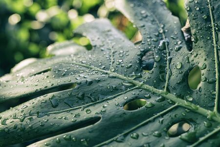 Monstera deliciosa leaf in the garden with rain drops.