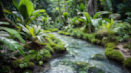 Blur background of waterfall in a lush tropical cave. Beautiful waterfall surrounded with tropical forest. Nature photography. Environment. Secluded paradise concept. Design for wallpaper. Spate.