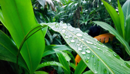 Water droplets on the leaves of a tropical plant after the rain