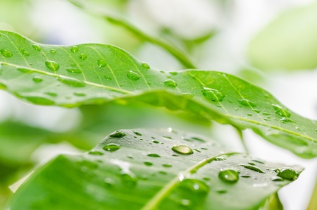 Rain water drops on green leafs