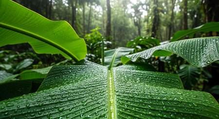 Banana leaf with raindrops in the forest. Tropical rainforest.