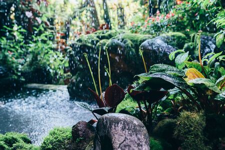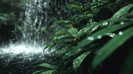 Waterfall in tropical rainforest. Rain drops on green leaves.
