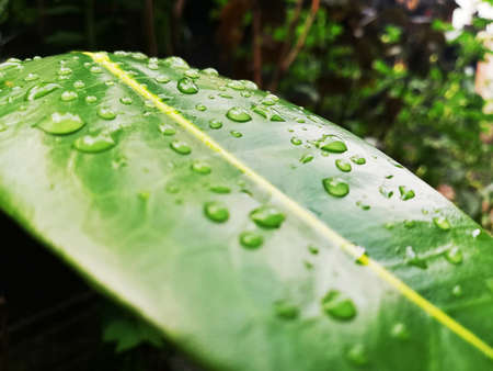 Raindrops on the leaves of a banana tree in the garden.