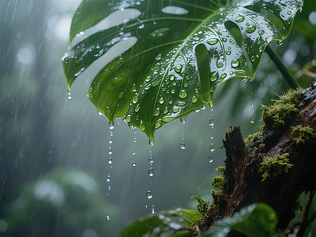 Tropical rainforest with rain drops flowing down the leaves.