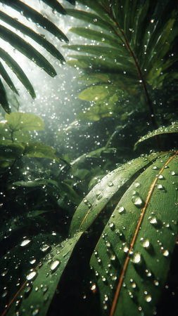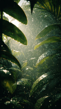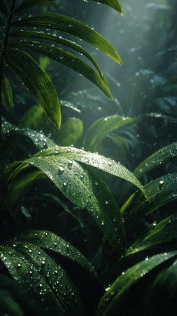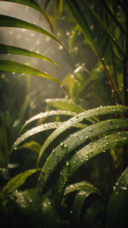 Rain falls gently on lush tropical foliage in a vibrant green landscape during a quiet afternoon