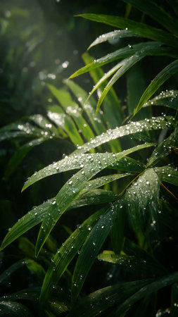 Lush and vibrant green leaves adorned with raindrops glistening in the sunlight